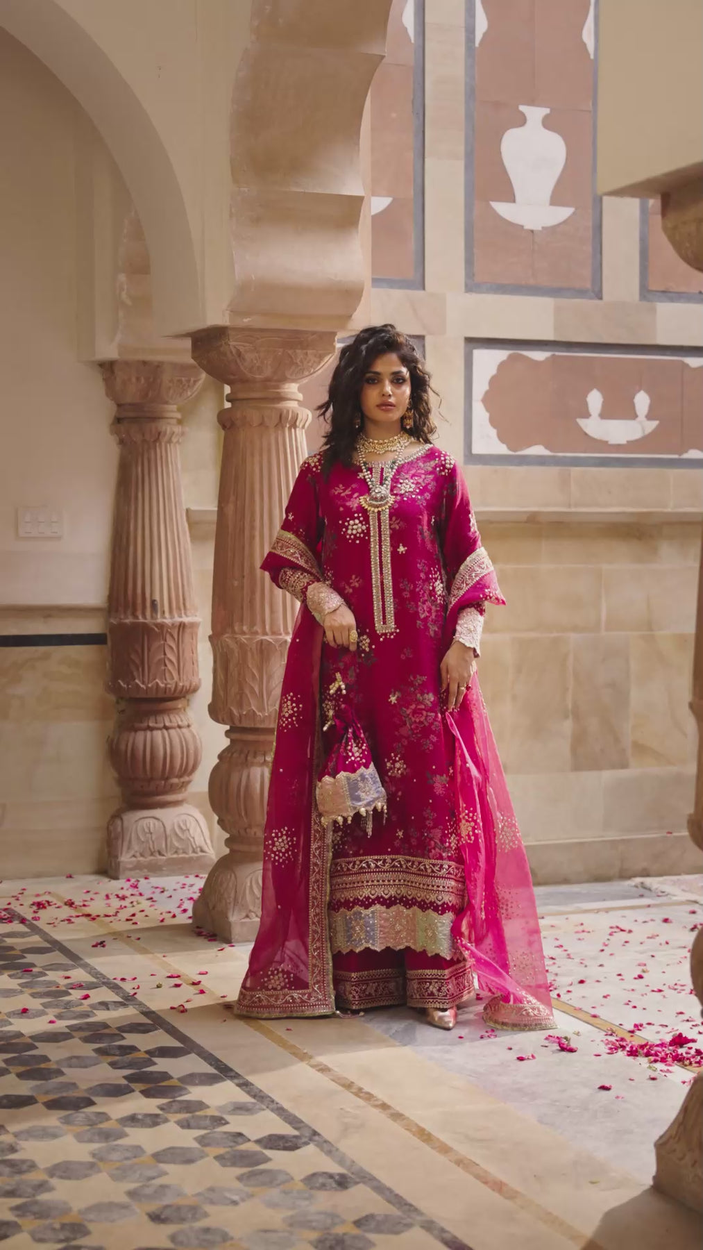 Radiating effortless luxury, Amira combines modern print with exquisite handwork and embellishment, where Swarovski, pearls, naqshi, and tassels glimmer across silk. The intricately crafted chatta patti border and embroidered organza dupatta elevate its festive elegance, a perfect balance of heritage detailing and contemporary allure.