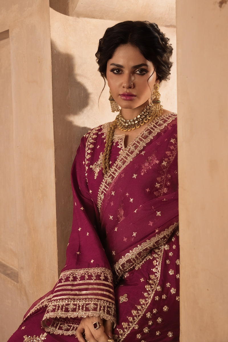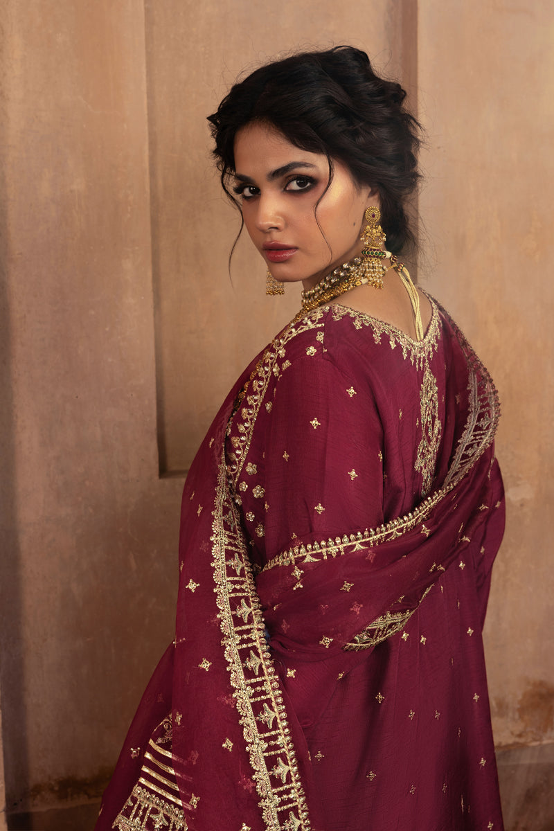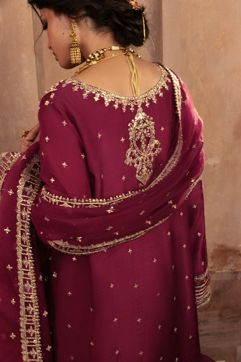 Zarin embodies understated opulence, crafted from Korean raw silk adorned with intricate embroidery and exquisite handwork featuring Swarovski, pearls, stones, and naqshi. Paired with a delicately embroidered organza dupatta, it reflects timeless craftsmanship and refined femininity - a true expression of grace, radiance, and sophistication.